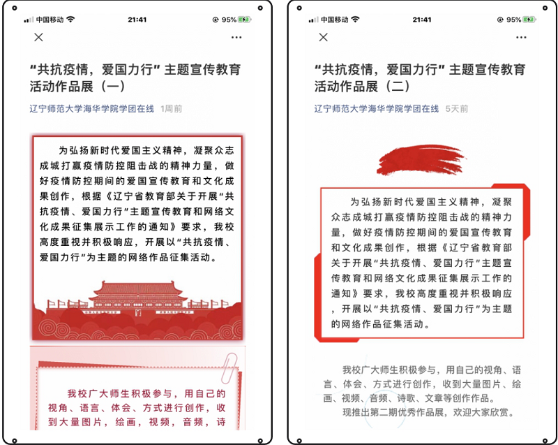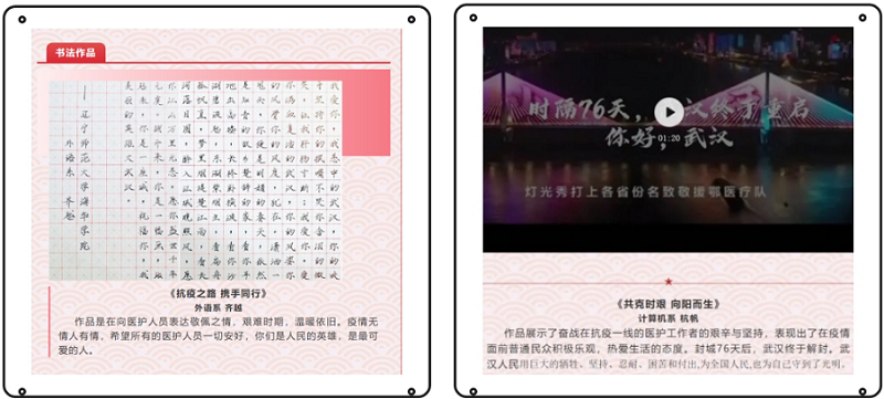 为做好疫情防控期间的爱国宣传教育和文化成果创作,开展了以“共抗疫情、爱国力行”为主题的网络作品征集活动。我校广大师生积极参与,用自己的视角、语言、体会、方式进行创作,收到大量图片、视频、音频、诗歌等作品。进一步激发了学生的使命感,传播了爱国主义精神,传递了“逆行者”精神,建立学生积极阳光心态,提高学生心理免疫力。