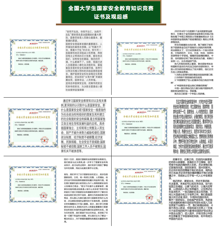 班会首先由各班团支书对“国家安全教育”精神发表感受,提出作为当代新青年,要热爱祖国、崇尚科学、辛勤劳动、团结互助、诚实守信,要严格要求自己,不断完善自己,成为保障国家安全的栋梁。接着,各班同学围绕“国家安全”主题积极踊跃的发言,表示要有维护国家安全的意识和能力,树立安全意识,掌握安全知识,提高自护自救能力,了解国家安全对每个公民的重要性。最后,各班团支书组织大家进行2020年全国大学生国家安全教育知识竞赛,并撰写心得体会。