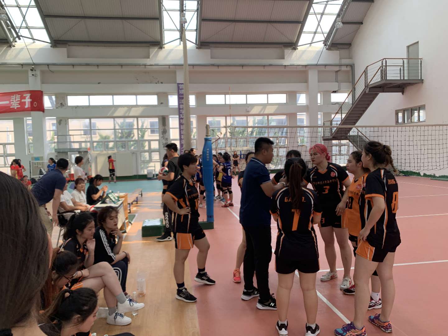 赛中,杨主任、唐教练细心分析场上形势,及时作出战术调整,使队伍在关键局反超大连工业大学,队员们在比赛中展现出的不为个人利益得失,顽强拼搏、不畏强队的意志品质,彰显了海华女排精神。