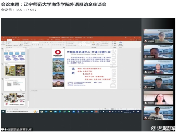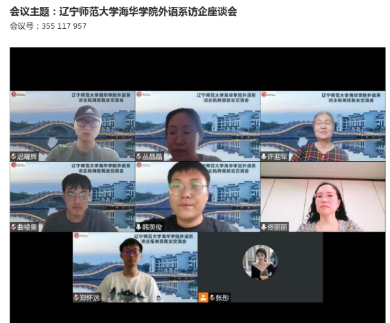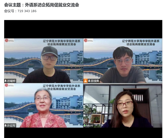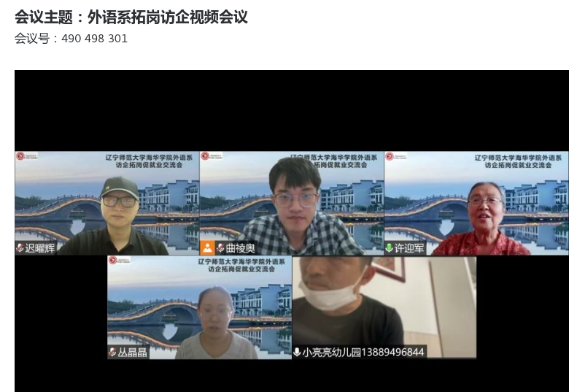 为响应学校就业工作部署,进一步加强外语系校企合作,拓展毕业生就业岗位。2022年7月14日,外语系主任许迎军,副主任迟曜辉,毕业年级辅导员曲祾奥、韩英俊,教学秘书郑怀远及部分专任教师与多家企业进行线上交流活动。