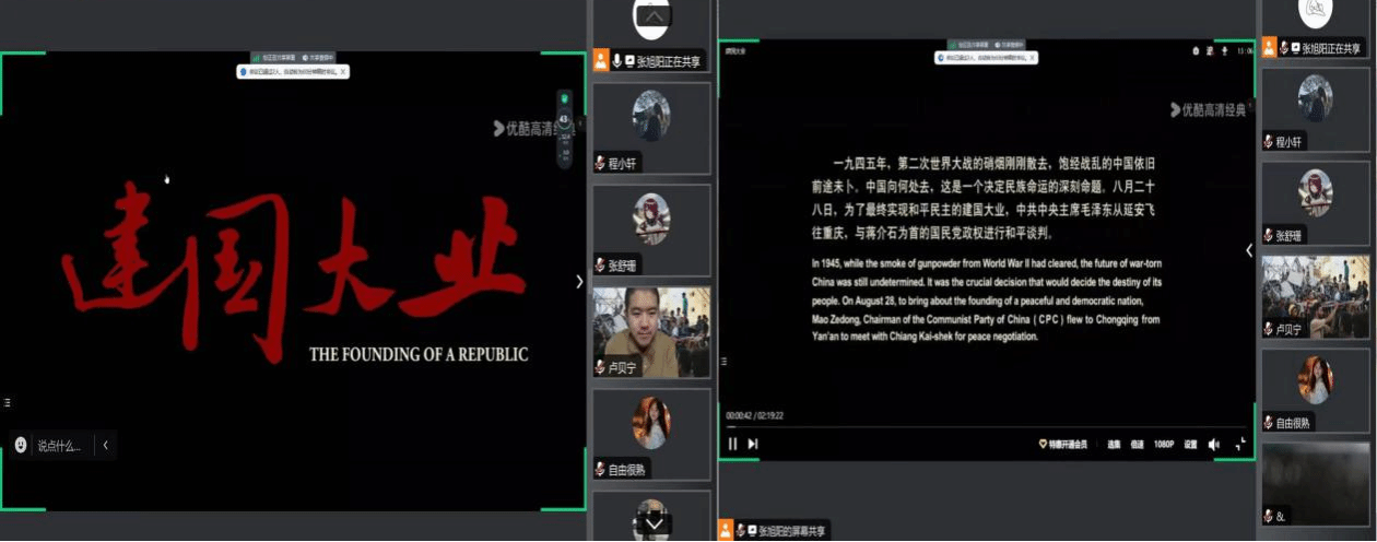 在系列活动中,还组织同学们进行了线上集体观影。影片《建国大业》增强了同学们的爱国意识,激发了同学们的爱国情怀。观影过程中,大家都沉浸于历史长河中,找寻内心深处与祖国的情感共鸣,每一个同学都深入其中,体会影片所蕴含的情怀,也留下了诸多思考。