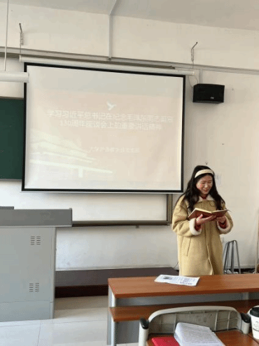 (3)由组织委员于晓宇代领全体党员学习习近平总书记在纪念毛泽东同志诞辰130周年座谈会上的重要讲话精神。学习结束后,陈雪同志进行交流发言:习近平总书记在座谈会上号召我们要更加紧密的团结起来,只争朝夕,顽强奋斗,沿着中国特色社会主义道路,为以中国式现代化全面推进强国建设民族伟业而奋勇前进。毛泽东同志及老一辈革命家的精神永远鼓舞着我们继续前进。我们生逢盛世,重任在肩,要继续发扬党的优良革命传统和作风,把家国情怀落实到具体的行动中。作为一名教师,我也从日常实践中感受到,要团结引领广大学生脚踏实地,集结优势,共同拼搏,用奋斗擦亮青春底色。